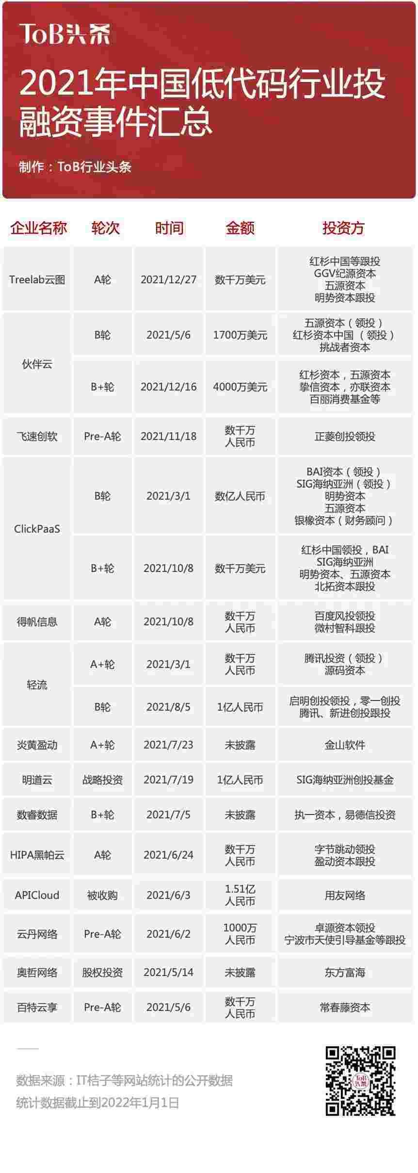 到2021年,,,无/低代码投融资规模势头更甚,,,,其中包括轻流两轮融资(A+轮数千万人民币,,B轮近亿人民币)、、、、圆梦钱包 两轮融资(B轮数亿人民币,,B+轮数千万美元)、、百特云享数千万元Pre-A轮融资......