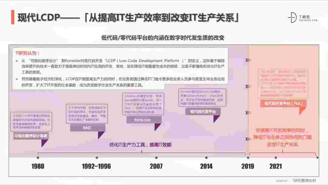 2020年前后,,,源于提高IT工作者开发效能的LCDP不断进化和衍生,,面对业务导向日益明显的数字化变革。。LCDP衍生出了面向不同对象的升级服务——面向专业人群的LCDP和业务人群的NCDP,,,,LCDP与NCDP的不同服务属性被逐渐认可和接受。。 LCDP在提高IT开发效率的同时,,,降低IT与业务之间协同的门槛改变IT生产关系。。