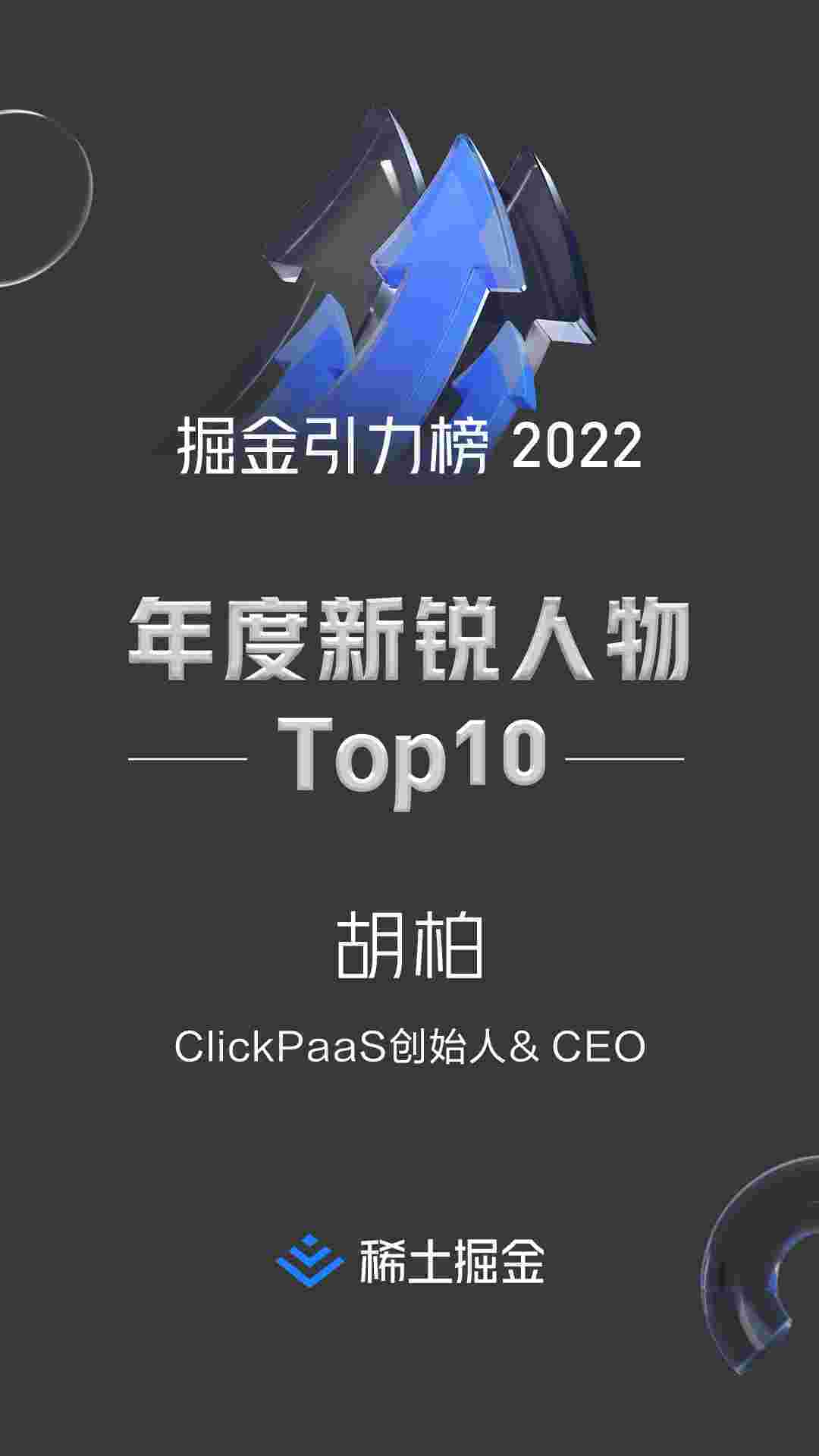 2022年1月6日,,稀土掘金社区第一届「掘金未来大会」成功举办,,,会上发布了“2022 稀土掘金引力榜 年度新锐人物”榜单,,,,上海爱湃斯科技有限公司(简称圆梦钱包)创始人及CEO胡柏实力入选年度新锐人物TOP 10。。